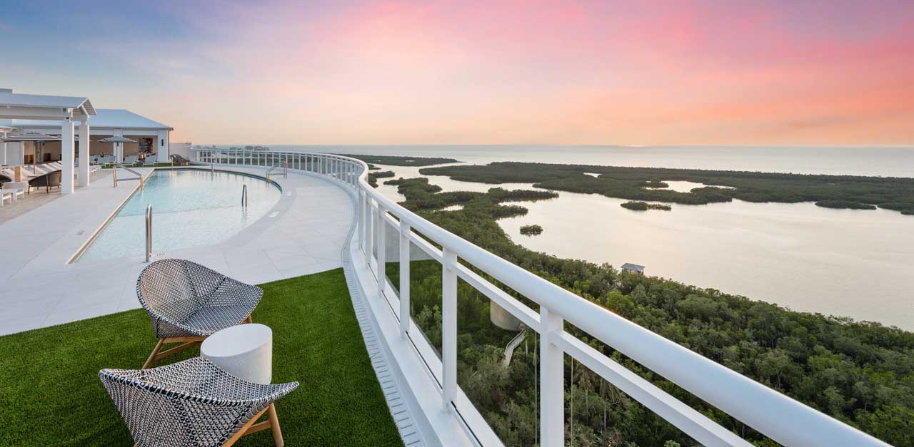 Residents will enjoy a plethora of top-tier amenities, such as a rooftop pool with stunning views, a state-of-the-art fitness center, and a 14,000-square-foot Wellness Center. The community also features an inviting club amenity center, complete with open-air dining, three pools, and a modern fitness area. The strategic design of Tower 500 ensures that every resident can savor breathtaking views and feel connected to Naples’s natural beauty.